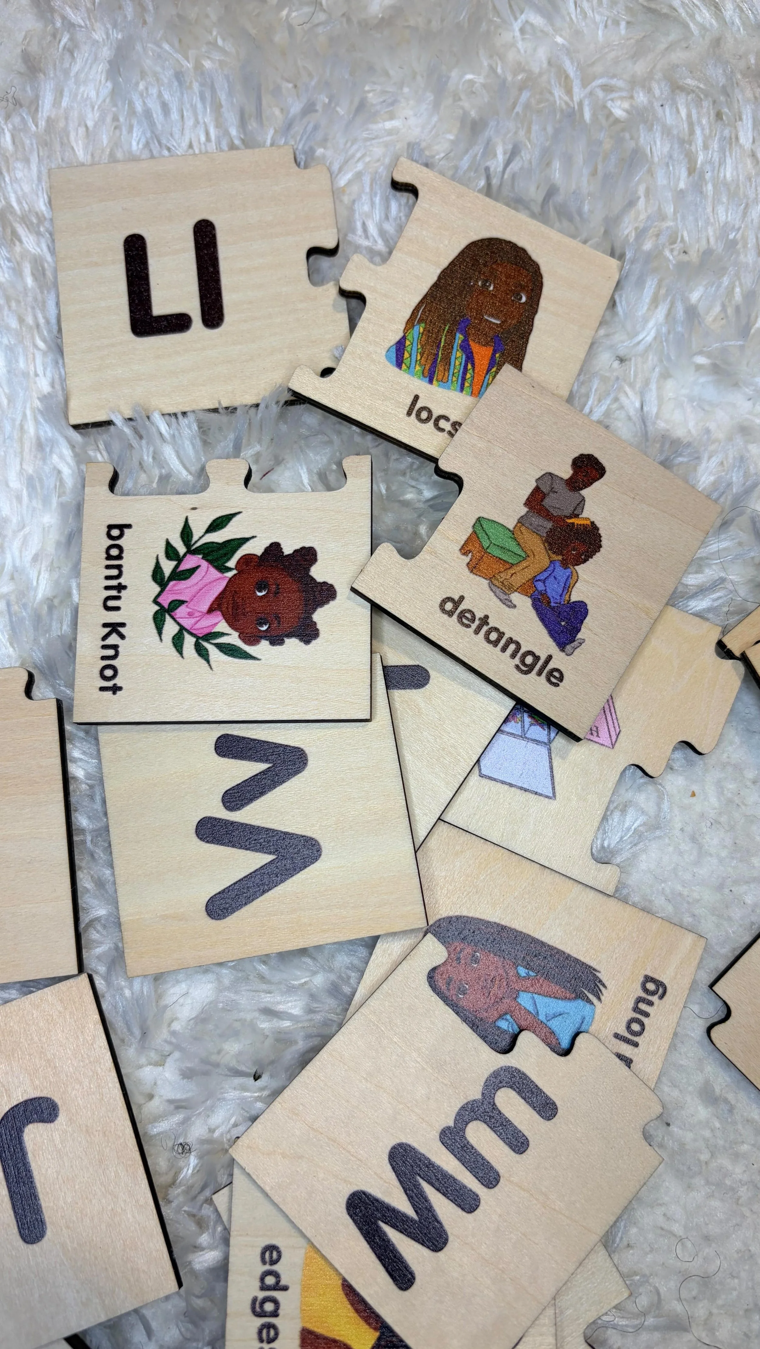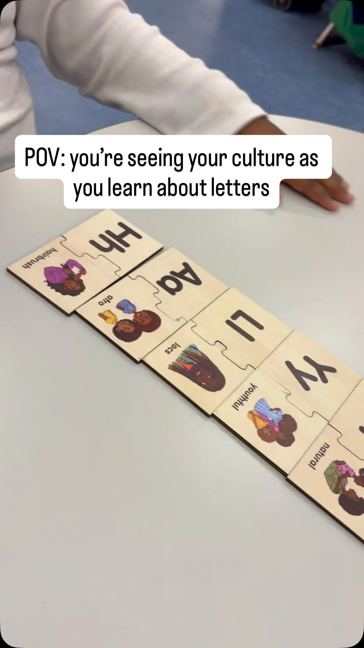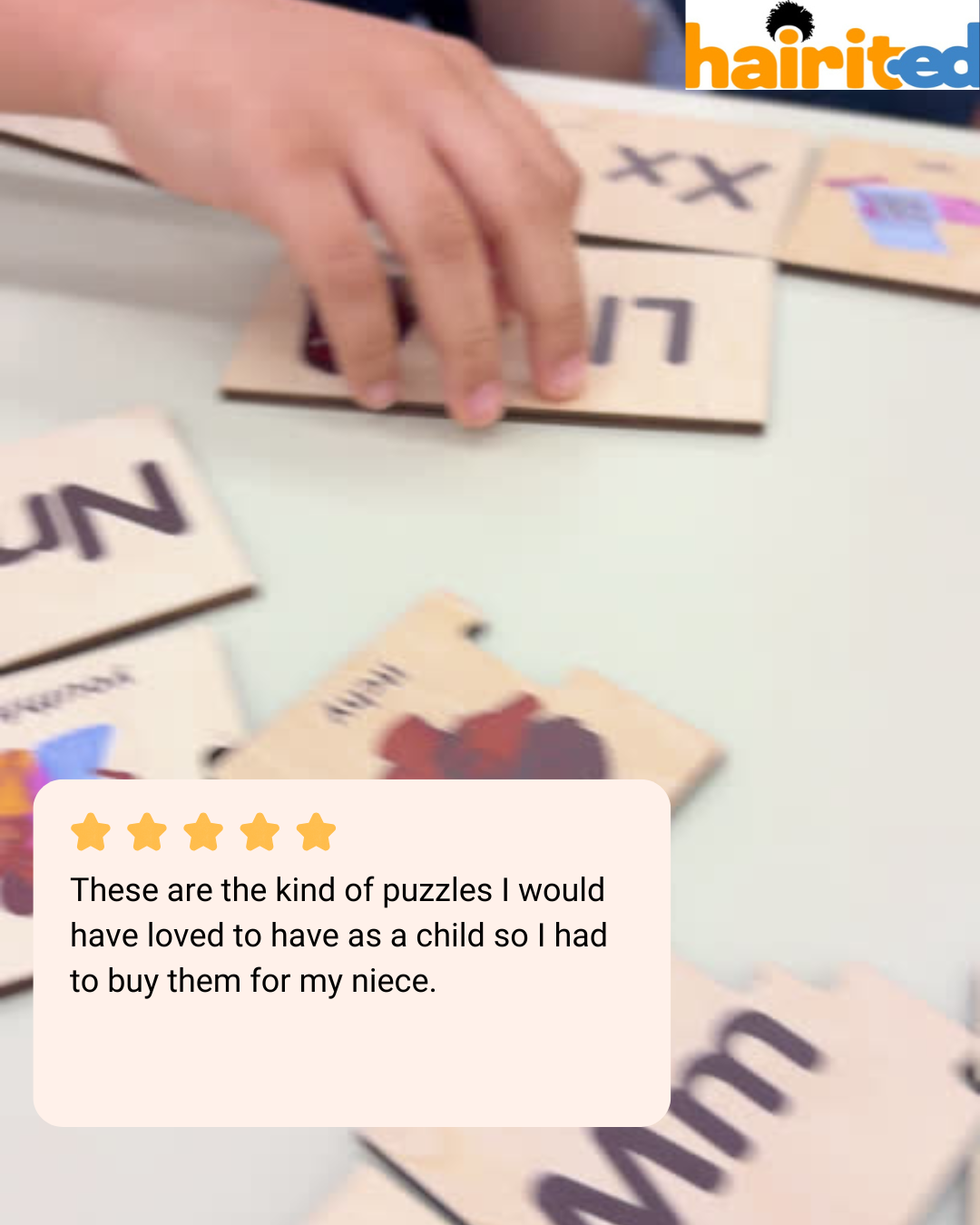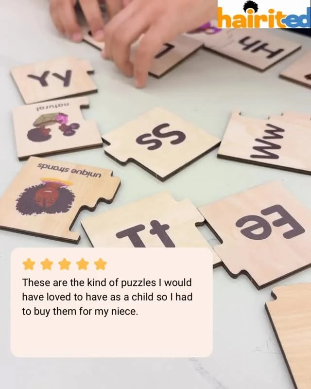 “ I wanted to take a moment and express gratitude but also give you a round of applause! I absolutely love the wooden alphabet puzzle! Each piece is so very beautiful, and unique. This product is truly something special, and something I would’ve loved to have as a child! The fact that you prioritized representation in the learning space means a lot to me! Well done!”
